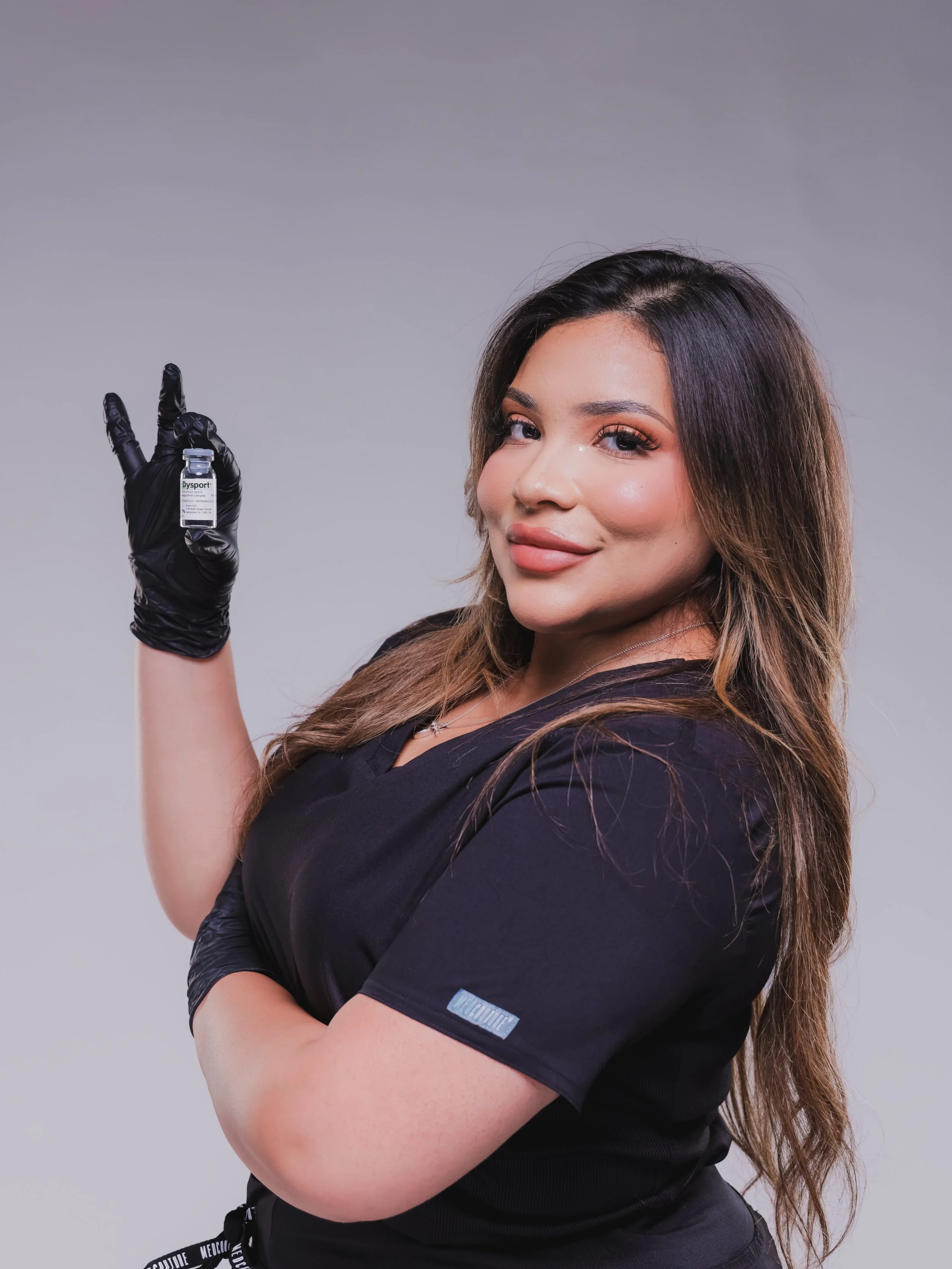 A woman in black medical scrubs and black gloves holding a small vial of medication, standing against a plain light gray background.