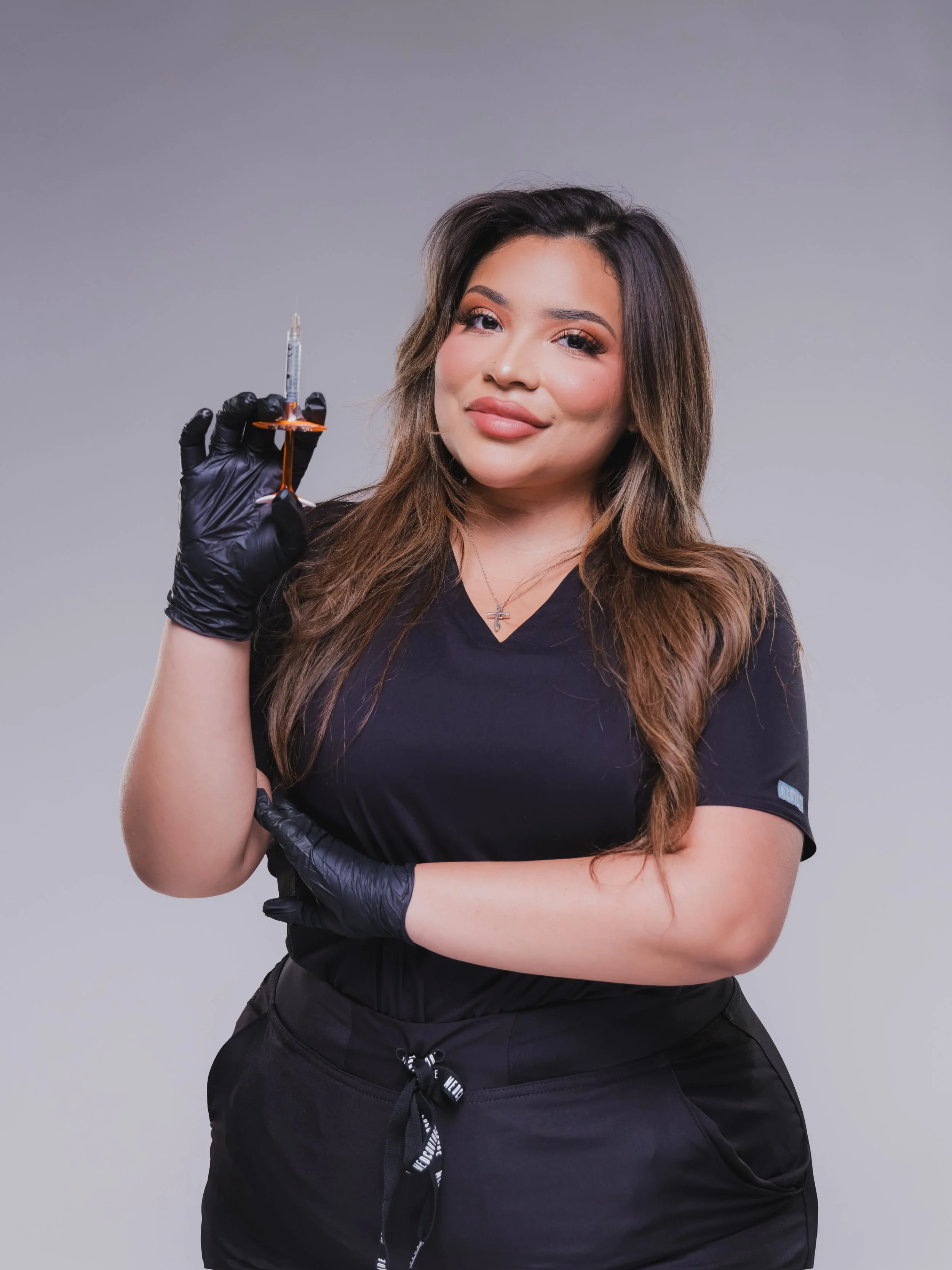 A woman with long brown hair wearing black scrubs and black gloves holding a syringe.